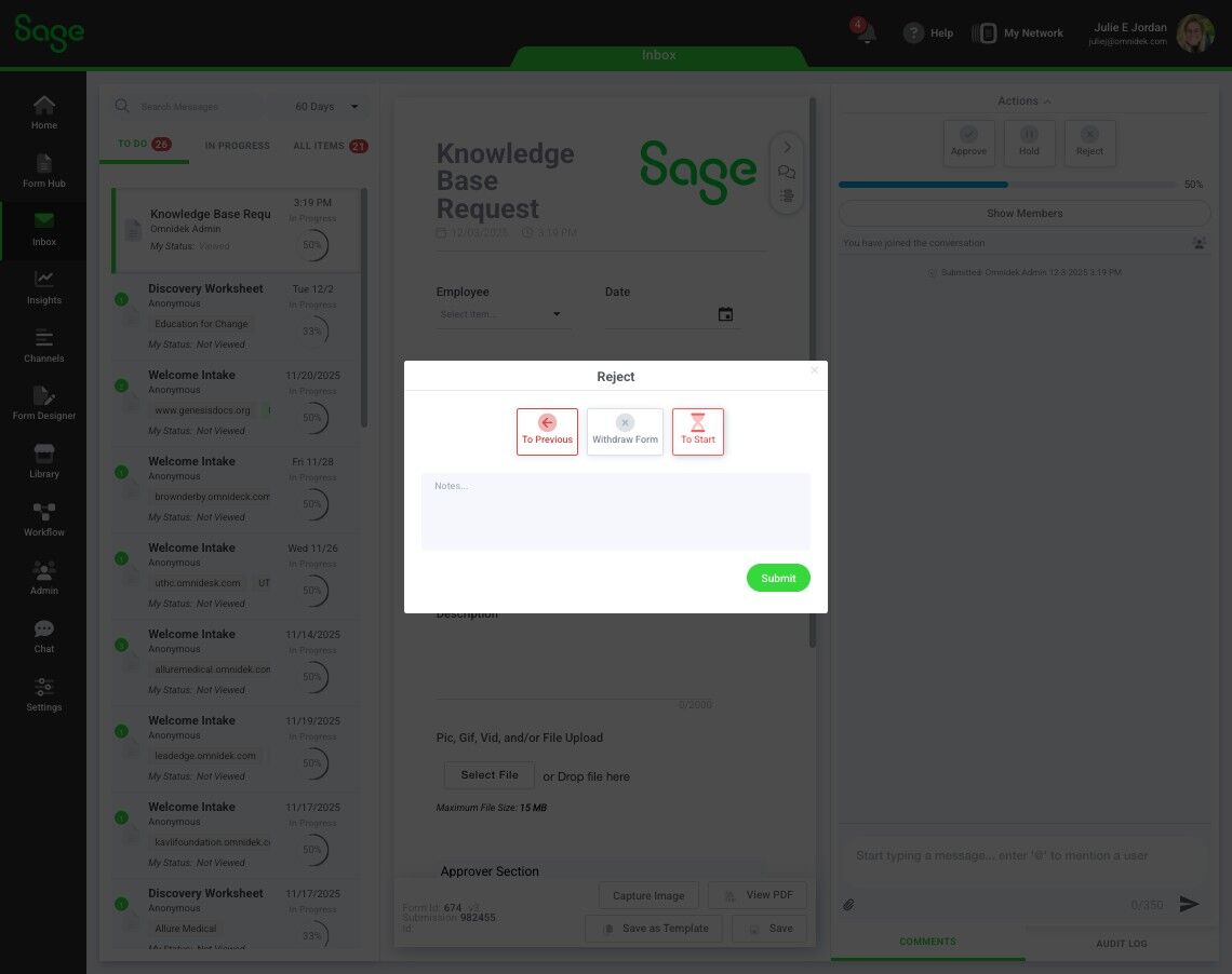 Find the submission you want to delete. As the Coordinator, choose Reject to Start sends the form back to the originating user and places the submission into an Unsubmitted state. At that point, the submission can be deleted either by the user who created it or by any user who has access to that user’s submissions (using Insights is typically the quickest method).