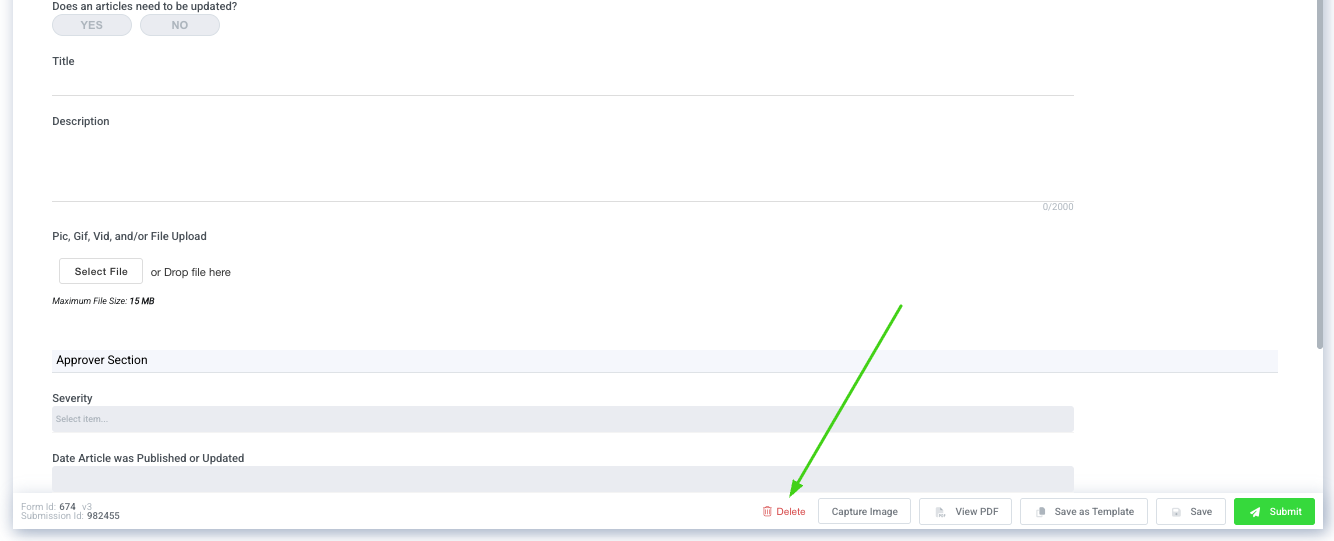 A submission can be deleted using the Trash Icon at the bottom ribbon of a submission.